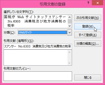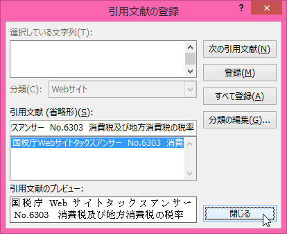 - [引用文献の登録]ダイアログボックスの[閉じる]ボタンをクリックします。