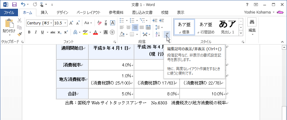 - [ホーム]タブを開き、[編集記号の表示/非表示]ボタンをクリックします。