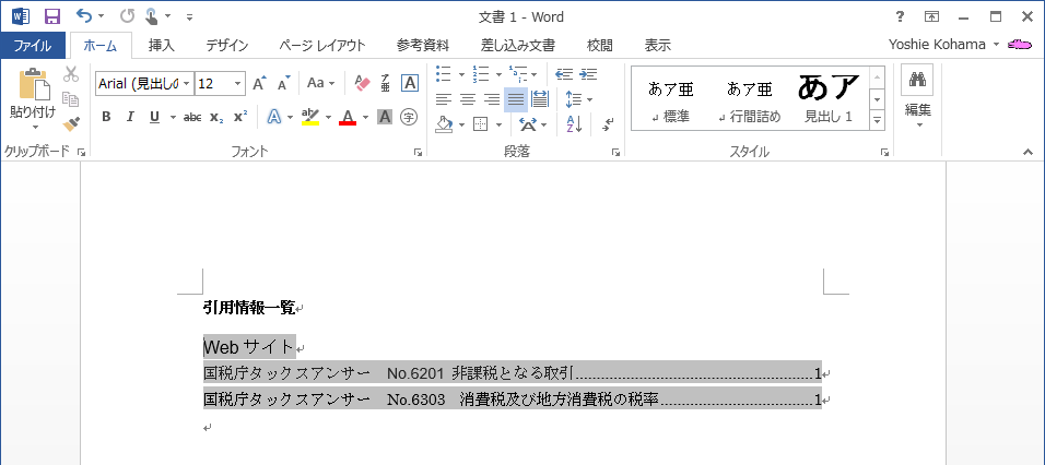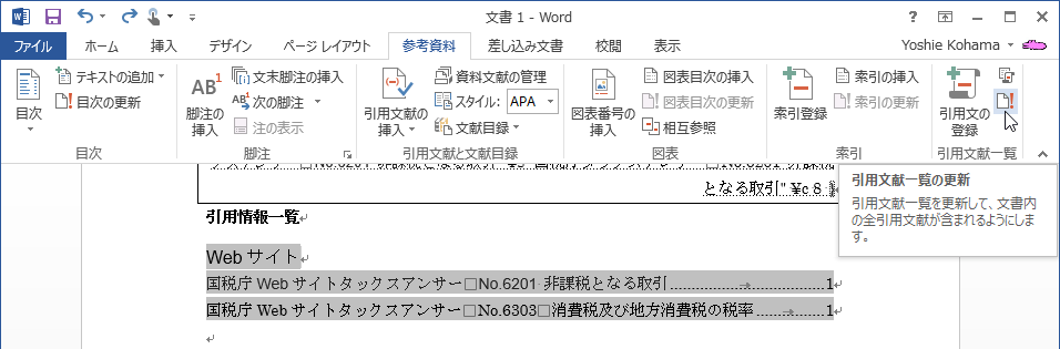 - 引用文献一覧フィールド全体を選択して[参考資料]タブを開き、[引用文献一覧]グループの[引用文献一覧の更新]をクリックします。