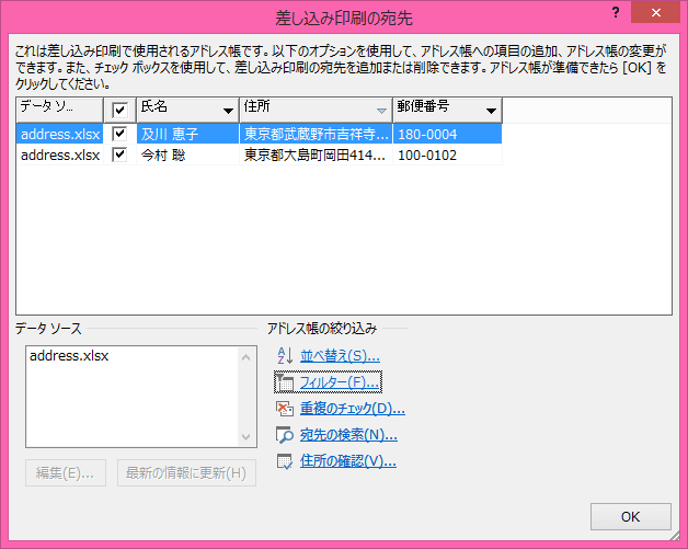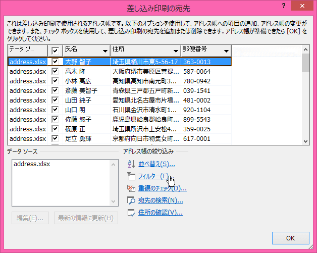 - [差し込み印刷の宛先]ダイアログボックスの右下の[フィルター]をクリックします。