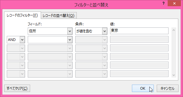 - 住所フィールドを選択し、[条件]ボックスの一覧から「が値を含む」を選択、[値]ボックスに「東京」と入力し、[OK]ボタンをクリックします。