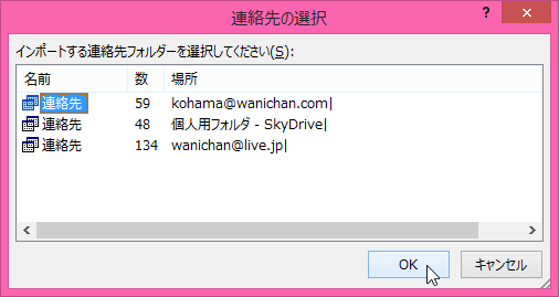 - [連絡先の選択]ダイアログボックスで、連絡先を選択して[OK]ボタンをクリックします。