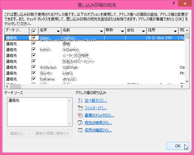 - [差し込み印刷の宛先]ダイアログボックスに反映されたら、適宜チェックボックスを使用して印刷除外するか否かを設定してから[OK]ボタンをクリックします。