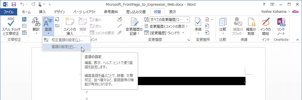 - [校閲]タブを開き、[言語]グループの[言語]を選択して[言語の設定]をクリックします。