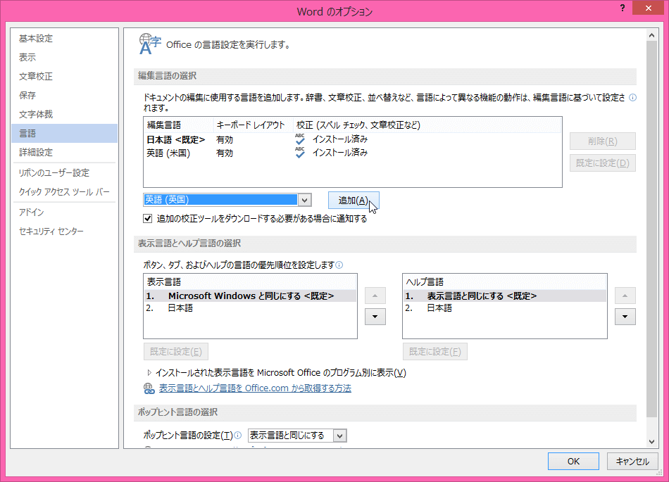 編集言語を他の言語に設定するには、[校閲]タブを開き、[言語]グループの[言語]を選択して、[言語の設定]をクリックして、[Word のオプション]の[Officeの言語設定]から行えます。Office.com から言語インターフェイス パック、校正ツール、ポップ ヒントを入手してインストールすると、日本語がわからない他国ユーザー向けにインターフェースやポップヒントもすべて他の言語に設定することも可能です。