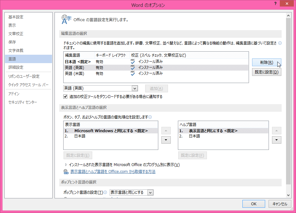 不要な編集言語を選択して、[削除]ボタンをクリックします。