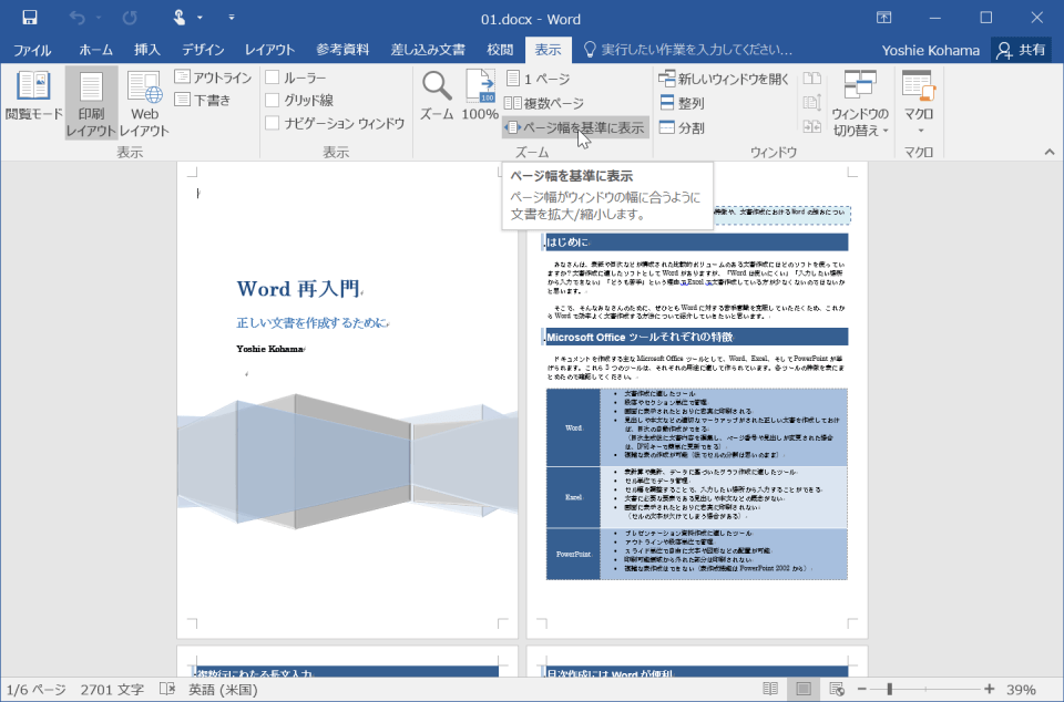 - [表示]タブを開き、[ズーム]グループの[ページ幅を基準に表示]をクリックします。