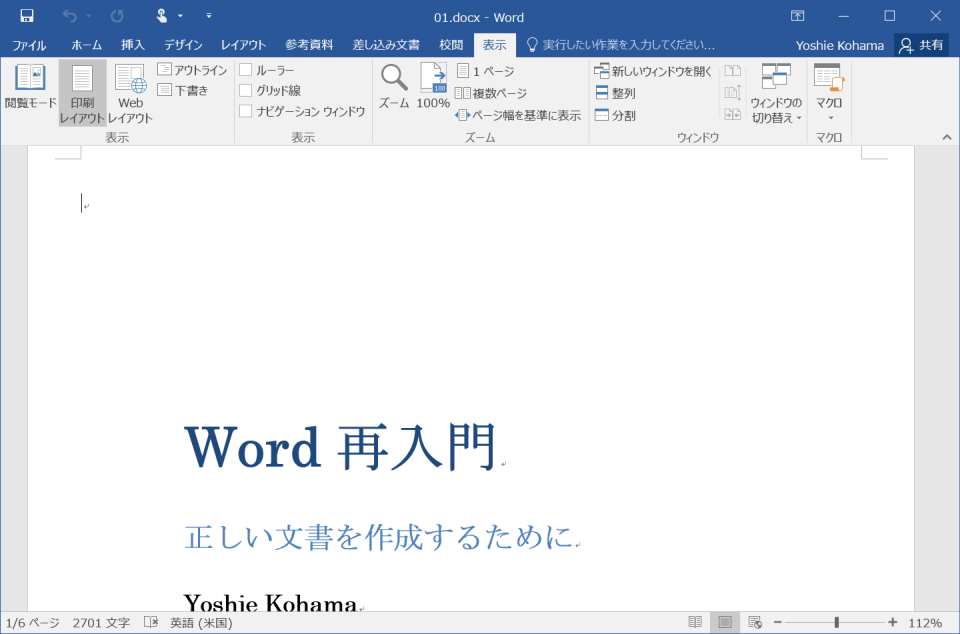 ページ幅がウィンドウの幅に合うように文書を拡大/縮小するには、[表示]タブを開き、[ズーム]グループの[ページ幅を基準に表示]をクリックします。