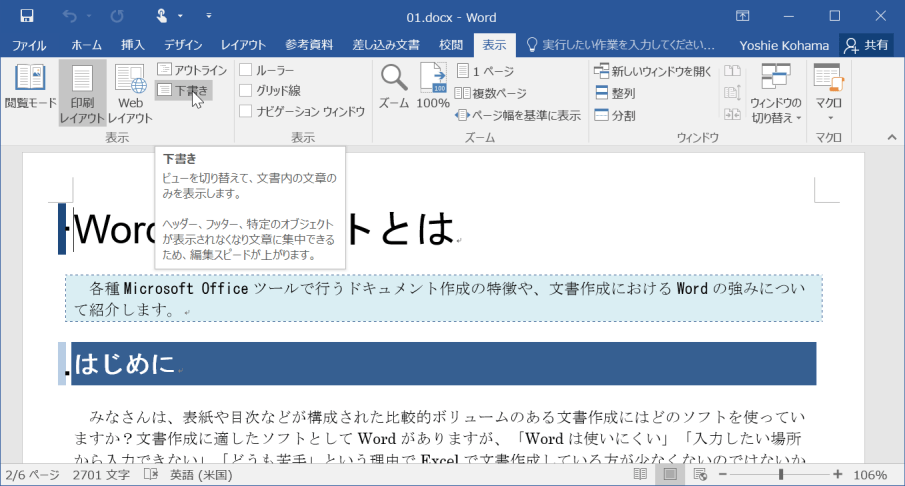- [表示]タブを開き、[下書き]を選択します。