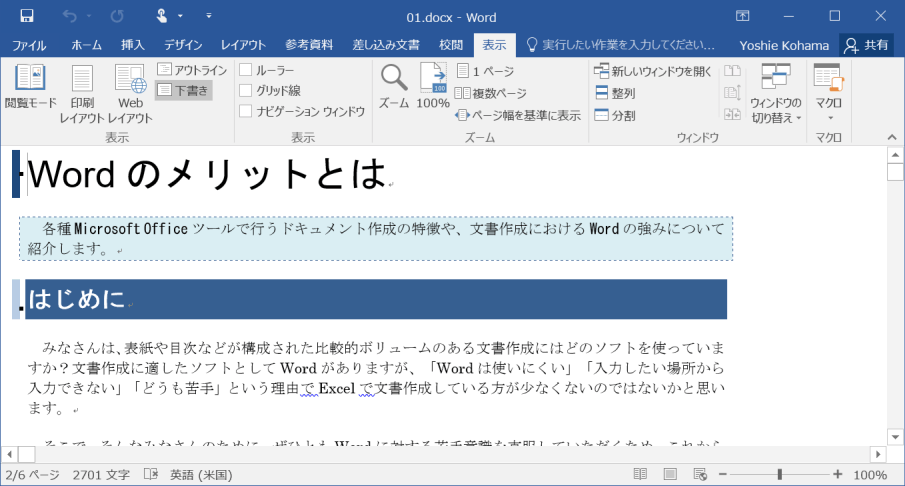 Word 2016で文書内の文章のみを表示するには、下書きビューに切り替えるとOKです。[表示]タブを開き、[下書き]を選択します。下書きビューに切り替えると、ヘッダー、フッター、特定のオブジェクトが表示されなくなり文章に集中できるため、編集スピードが上がります。