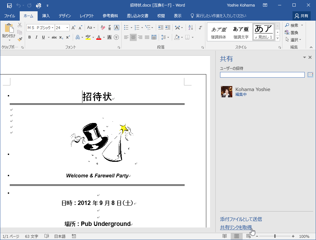 電子メールアドレスが不明な場合、あるいは、不特定多数の人たちに文書を見せたい場合、文書へのリンクを作成するとOKです。表示リンクは編集は許可されず、閲覧のみとなります。