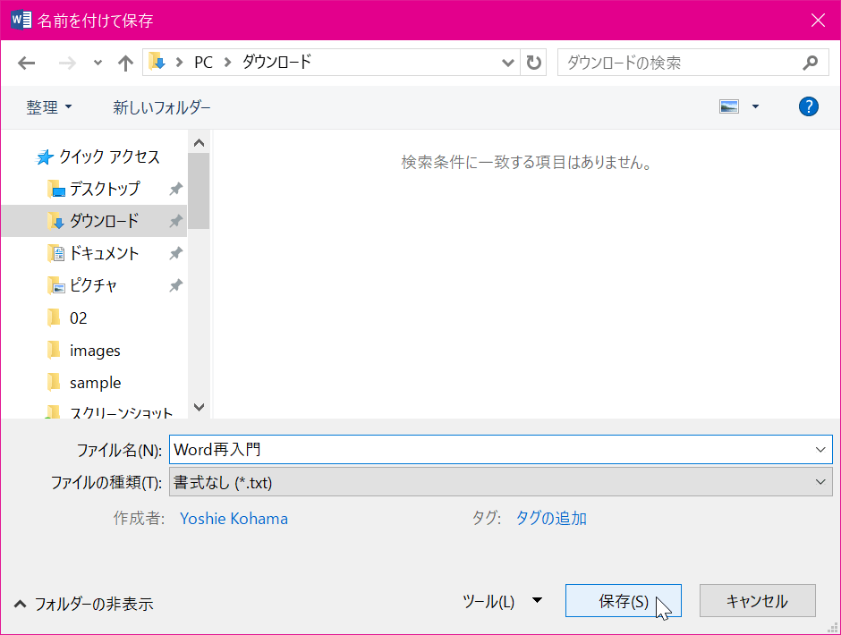 - [ファイルの種類の変更]を選択して、[文書ファイルの種類]一覧から[書式なし]をダブルクリックします。