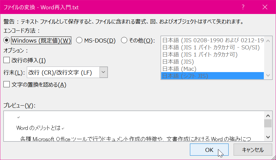 - [ファイルの変換]ダイアログボックスが表示されます。エンコード方法などを指定して[OK]ボタンをクリックします。