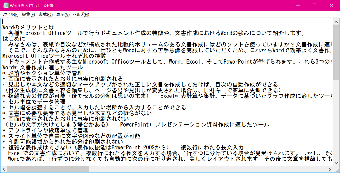 メモ帳でも開けるように、テキストファイル形式に変更することもできます。ただし、画像や図形などはもちろん、書式情報はすべて失われるので注意してください。