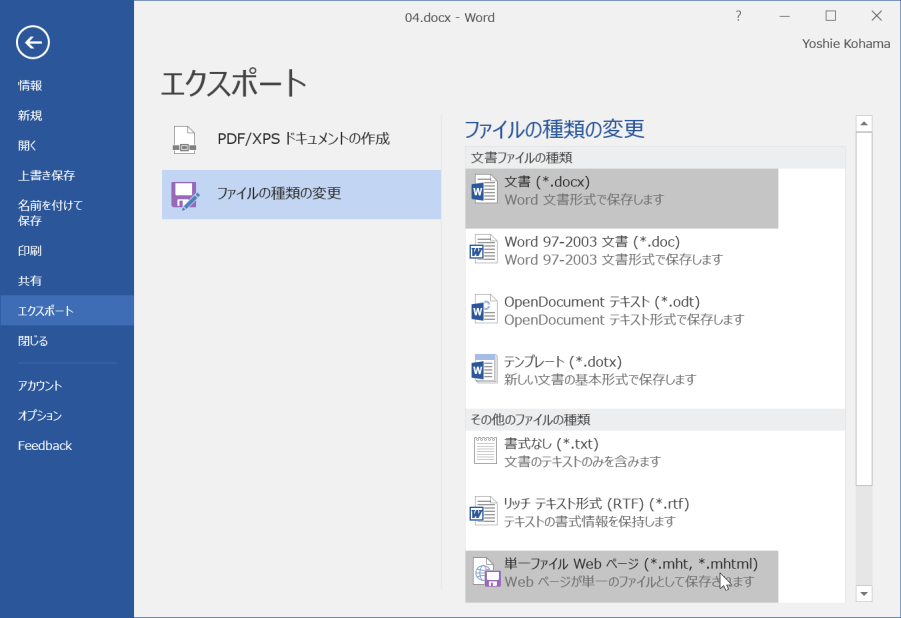 単一ファイルWebページとは、テキストや画像などが一つのカプセルになったファイルであり、電子メールに添付することができます。このファイルは、Internet Explorerで開けます。Word 2016では[ファイル]タブの[エクスポート]を選択して、[ファイルの種類と変更]を選択し、[単一ファイルWebページ]を選択します。