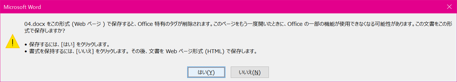 - フィルター後のWebページの場合、Office固有のタグが削除されるメッセージが表示されます。確認後[はい]ボタンをクリックします。