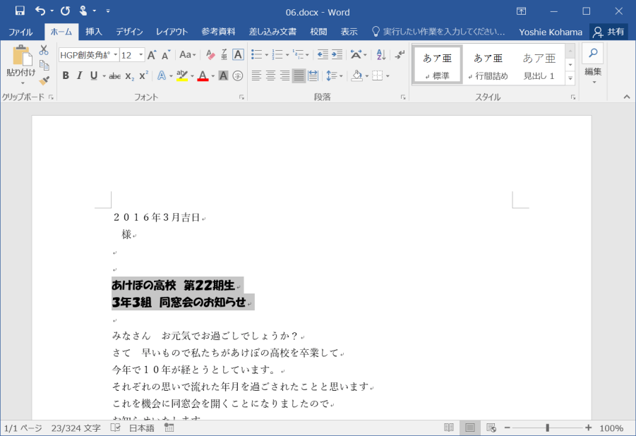 Word 2016既定のフォントサイズは10.5ポイントです。対象となる文字を選択して、[ホーム]タブの[フォント]グループにある[フォント]ボックスの隣の[フォントサイズ]ボックスからフォントサイズを選択します。ショートカットキーはCtrl+Shift+Pです。
