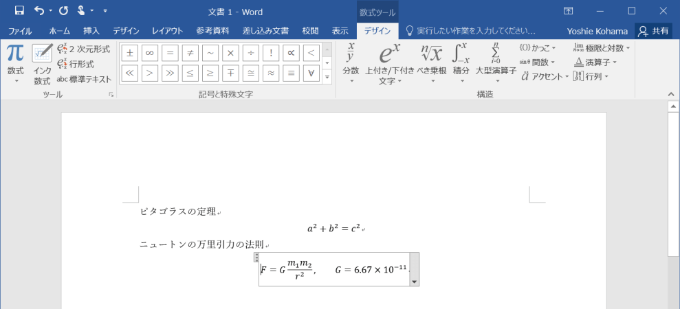 - [Office.comのその他の数式]をポイントして、[ニュートンの万里引力の法則]を選択します。