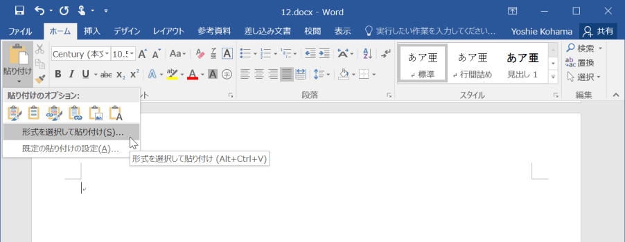 - Wordにタスクを切り替えて、[ホーム]タブの[クリップボード]グループの[貼り付け]の▼をクリックして[形式を選択して貼り付け]を選択します。