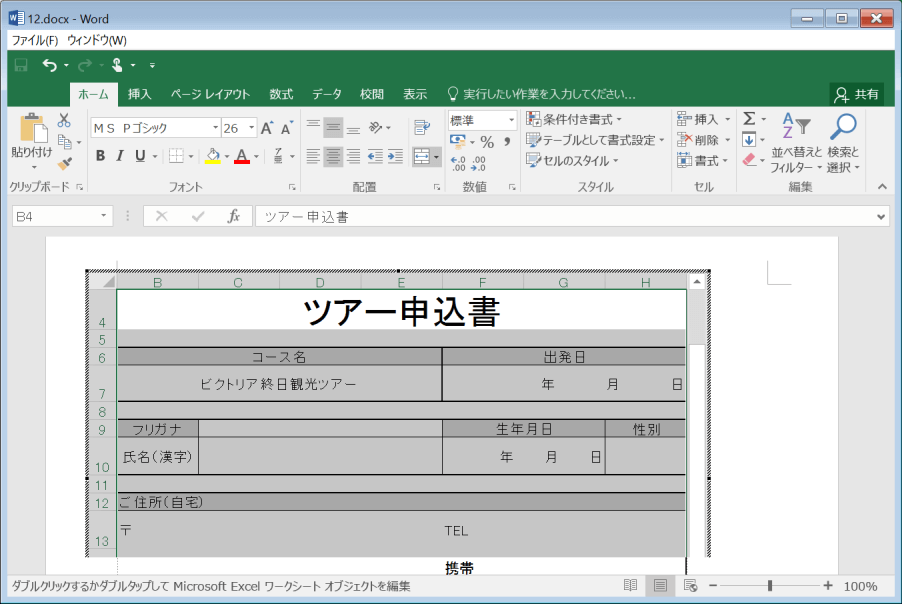 作成・変更されたデータはあくまでもWord中のExcelワークシートオブジェクトに保存されます。リンクオブジェクト
