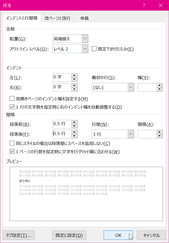 - [段落]ダイアログボックスの[インデントと行間幅]タブが開かれたら[間隔]グループの[段落前]や[段落後]にそれぞれ間隔を指定して[OK]ボタンをクリックします。