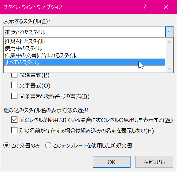 既定では、「推奨されたスタイル」がスタイルウィンドウに表示されます。他に「使用中のスタイル」「作業中の文書に含まれるスタイル」「すべてのスタイル」があります。Word 2016でスタイルウィンドウの[オプション]のリンクをクリックして、[スタイルウィンドウオプション]ダイアログボックスの[表示するスタイル]ボックス一覧より選択します。