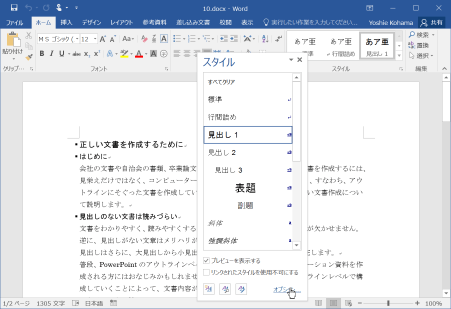 - スタイルウィンドウの[オプション]のリンクをクリックします。