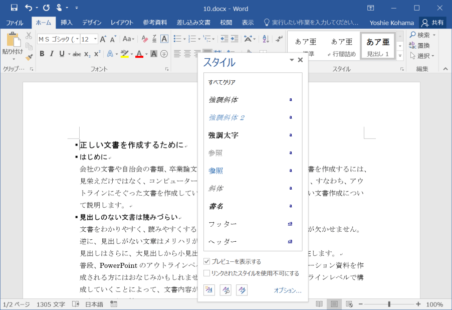 既定では推奨順にスタイルウィンドウにスタイルが表示されます。ほかに「アルファベット順」「フォント順」「基準となったスタイル順」「種類順」に表示順序を変更できます。Word 2016でスタイルウィンドウの[オプション]のリンクをクリックして、[スタイルウィンドウオプション]ダイアログボックスの[スタイルの表示順序]ボックス一覧より選択します。