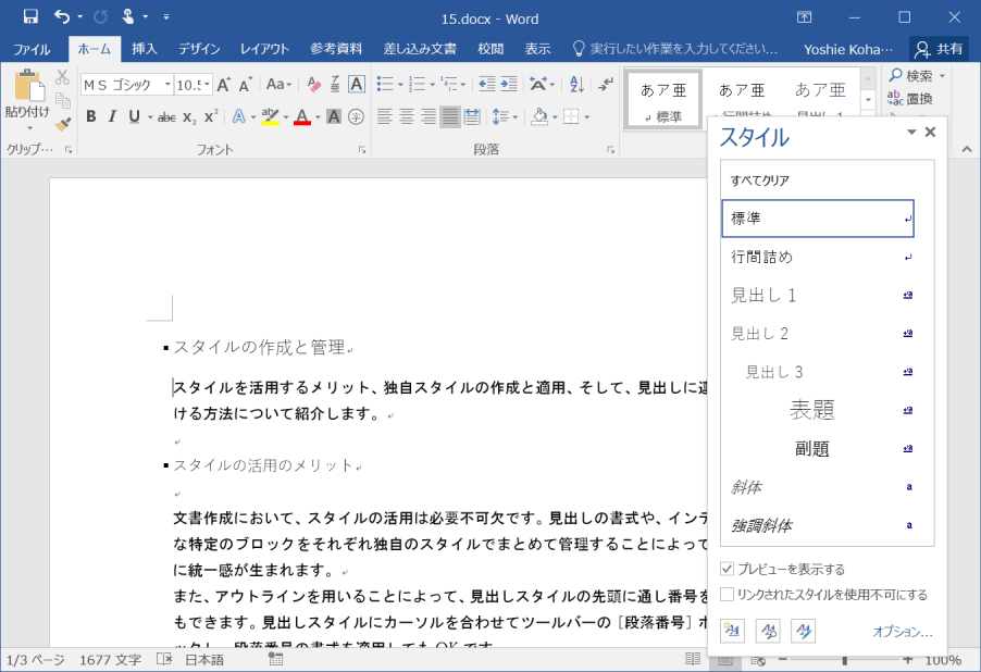 変更するには、スタイルギャラリー一覧から、もしくは[スタイル]ウィンドウからのいずれかで行えます。