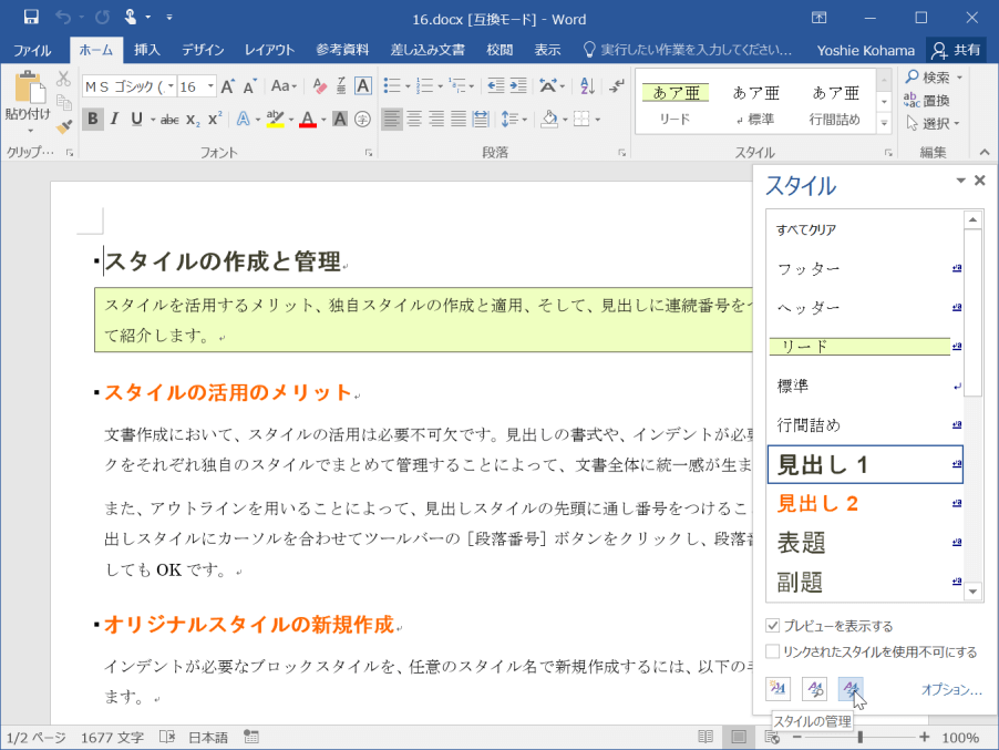 [スタイルの管理]ボタンをクリックします。