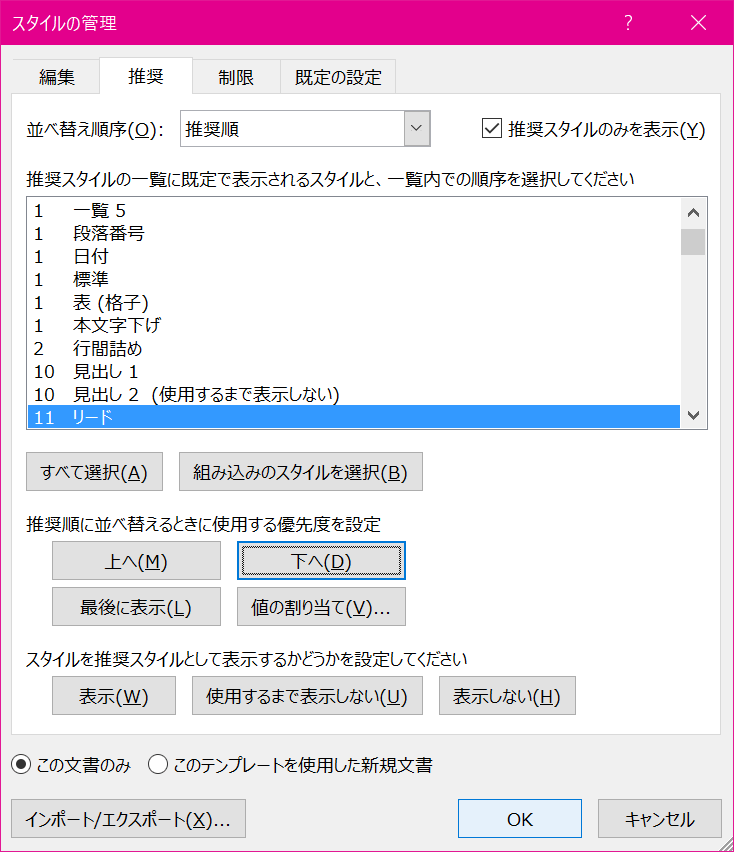 - 順序を変更したいスタイルを選択して[上へ]または[下へ]ボタンをクリックします。