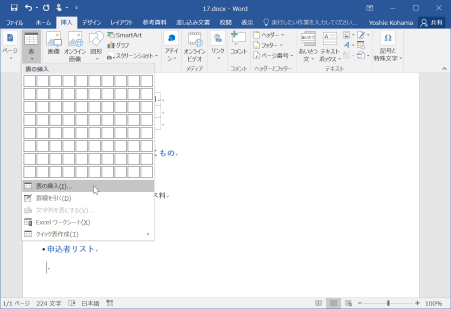 Word 2016で表を挿入するには、マウスで行列指定する方法と、[表の挿入]ダイアログボックスを表示して挿入する方法の2通りあります。ここでは、[表の挿入]ダイアログボックスを表示して挿入する方法について説明します。