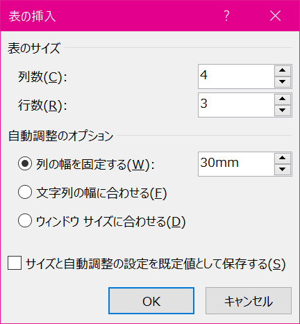 なお、[表のプロパティ]ダイアログボックスで、自動調整のオプションを変更してそれを既定値として保存することも可能です。