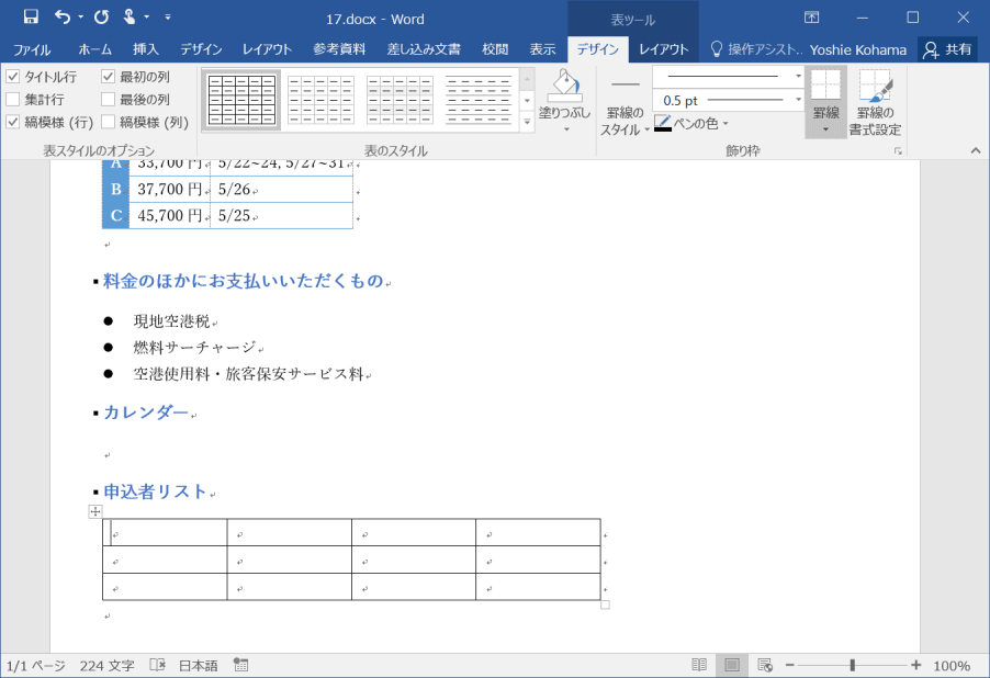 ここでは、サンプルファイルを使って、最終行に3行4列の表を、すべての列の幅を「30mm」に固定して挿入する方法について説明します