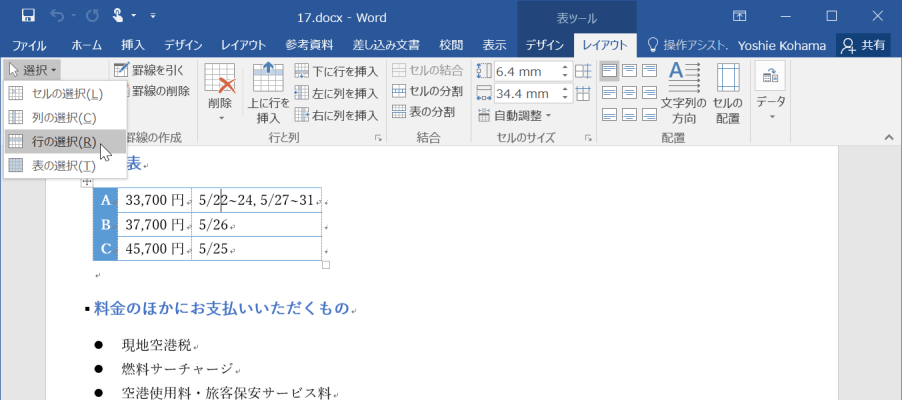 - [表]グループの[選択]をクリックし、[行の選択]をクリックします。