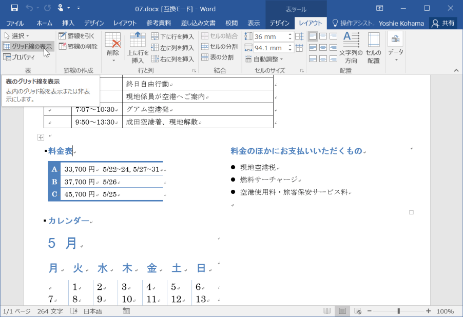 Word 2016でグリッド線の表示・非表示を切り替えるには、[表ツール]の[レイアウト]タブを開き、[グリッド線の表示]をクリックします。