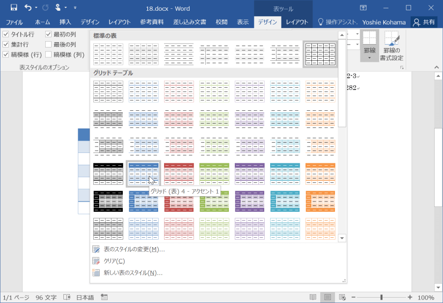 Word 2016でスタイルごとに異なる罫線や網掛けを使って、表の見た目を変更するには、対象となる表内にカーソルを移動し、[表ツール]の[デザイン]タブをクリックして、[表のスタイル]のスタイル一覧から適用したいスタイルを選択します。