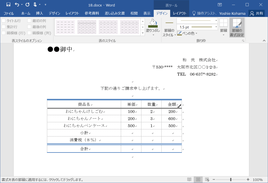 - 表の罫線にクリックしてドラッグして適用します。