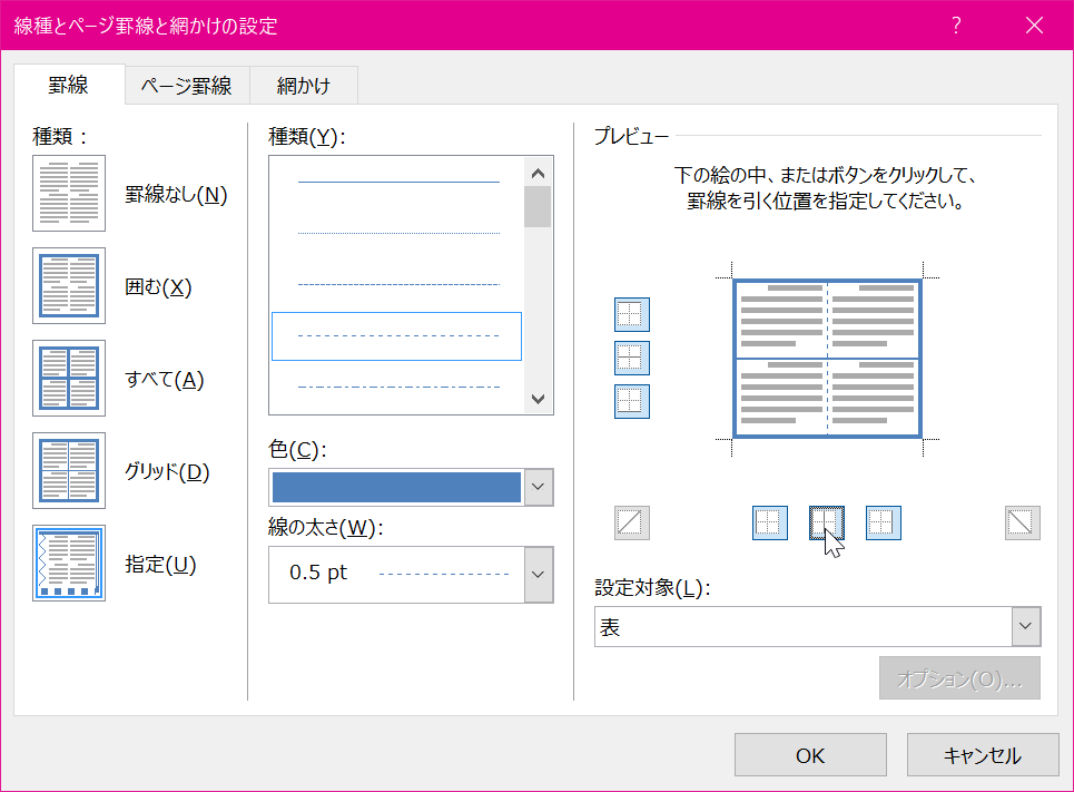 - [線種とページ罫線と網掛けの設定]ダイアログボックスが表示されました。