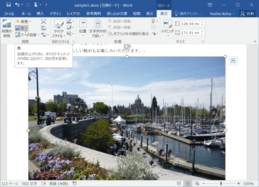 Word 2016でドキュメントの内容に合わせて図の色を変更するには、対象となる図を選択して[図ツール]の[書式]タブを開き、[色]の[色の変更]一覧から選択します。