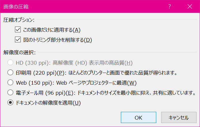 - [図の圧縮]ダイアログボックスで、圧縮オプションや解像度を選択して[OK]ボタンをクリックします。