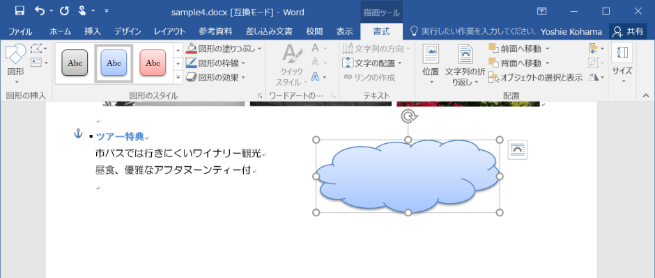 - 図形を選択し、[描画ツール]の[書式]タブを開きます。
