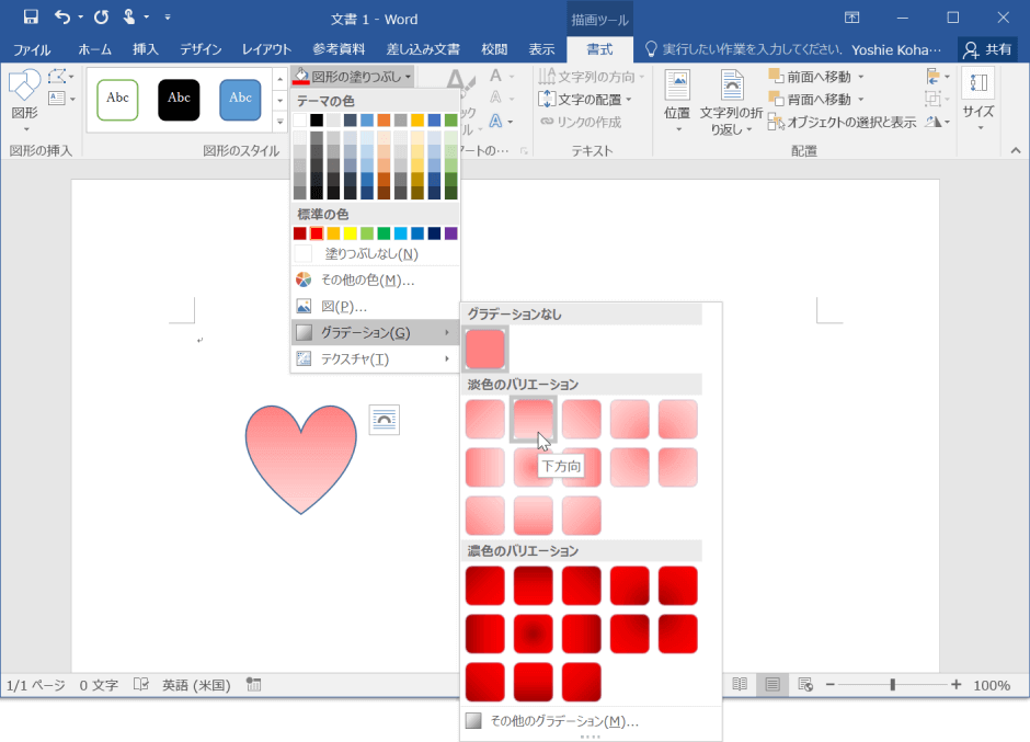 希望する図形の塗りつぶしスタイルがWord 2016のクイックスタイル一覧にない場合は、塗りつぶしスタイルを自作できます。対象となる図形を選択し、[描画ツール]の[書式]タブを開いて、[図形のスタイル]グループの[図形の塗りつぶし]をクリックし、一覧から色を選択してグラデーション効果を追加するとよいでしょう。
