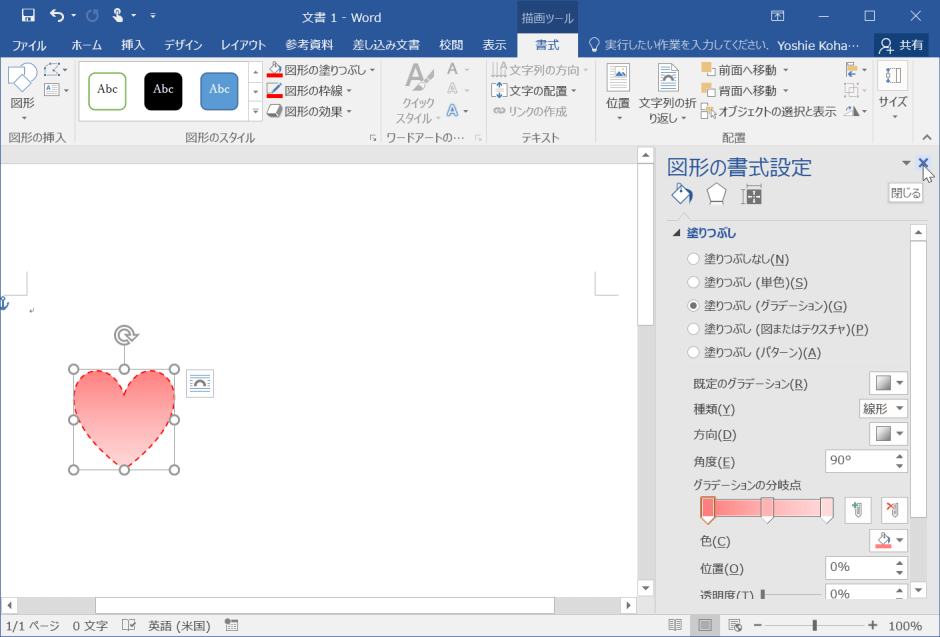 [図形の書式設定]作業ウィンドウを閉じるには、右上の[閉じる]ボタンをクリックするとOKです。