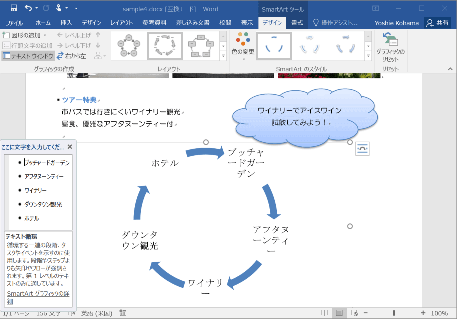 Word 2016でSmartArtグラフィックのテキストウィンドウを表示するには、[SmartArtツール]の[デザイン]タブを開き、[グラフィックの作成]グループの[テキストウィンドウ]をクリックします。テキストウィンドウを使うとSmartArtグラフィック内のテキストの入力や構成が容易に行えます。