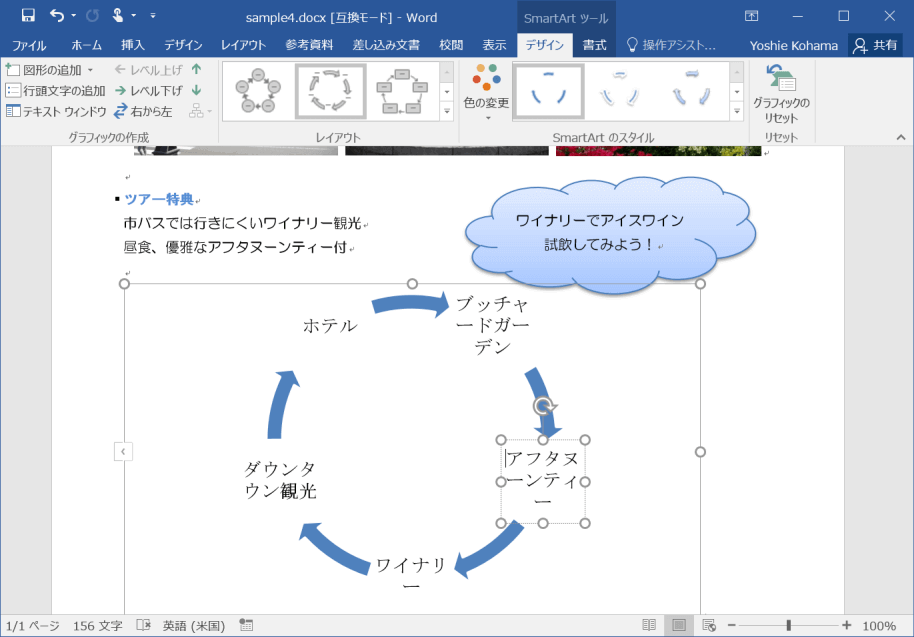- 対象となる項目を選択して[SmartArtツール]の[デザイン]タブを開きます。