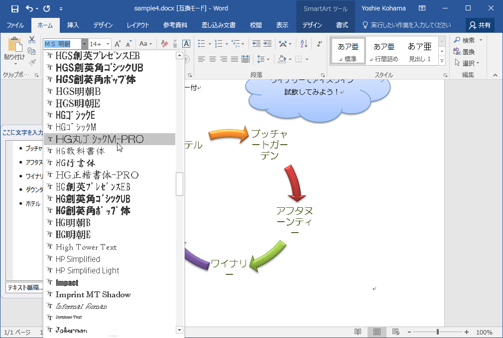 Word 2016でSmartArtグラフィックの文字色を変更するには[SmartArtツール]の[書式]タブを開き、[文字の塗りつぶし]一覧から変更したい色を選択します。フォントの種類を変更する場合は[ホーム]タブの[フォント]ボックス一覧から選択します。なお、SmartArtグラフィックの文字はワードアートの位置づけになっているため、任意でワードアートのスタイルを適用してもOKです。
