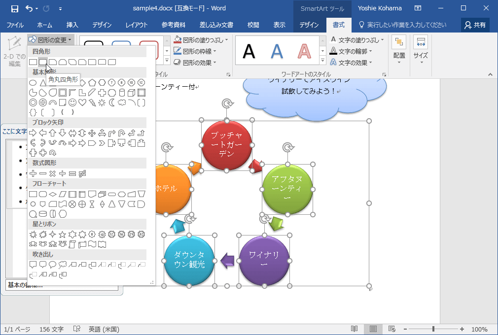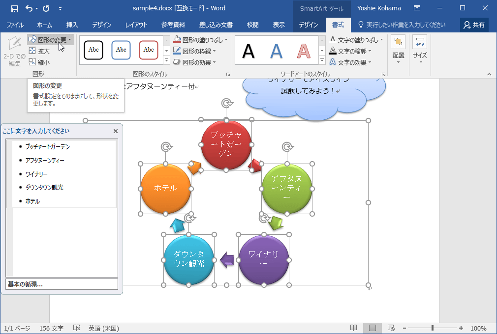 Word 2016でSmartArtの書式設定はそのままにして、形状を変更するには、SmartArtの図形を選択し、[SmartArtツール]の[書式]タブを開いて、[図形]グループの[図形の変更]一覧から図形を選択します。