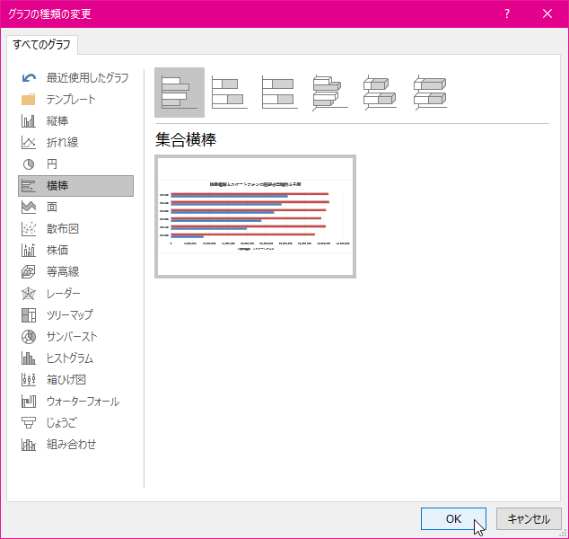 - [グラフの種類の変更]ダイアログボックス一覧から横棒グラフを選択します。