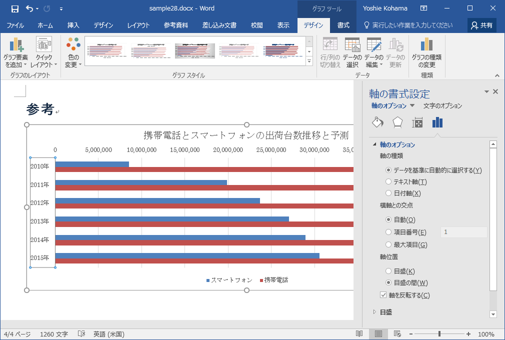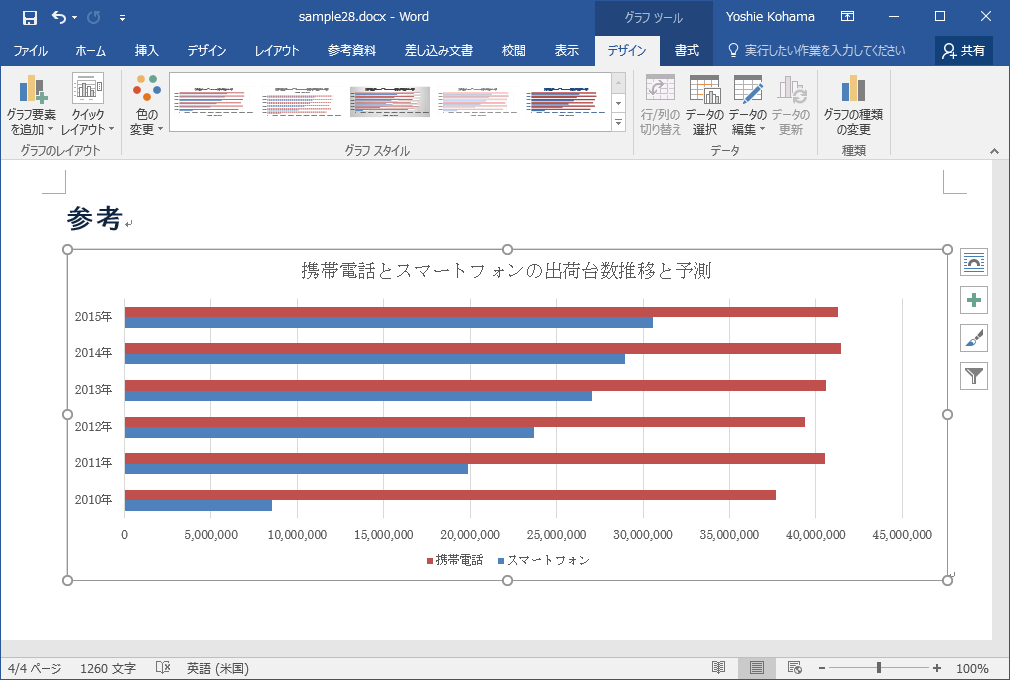 Word 2016でたとえば、折れ線グラフから棒グラフに変更するには、グラフを選択して[グラフツール]の[デザイン]タブを開き、[グラフの種類の変更]一覧より変更したいグラフを選択します。